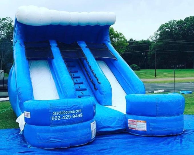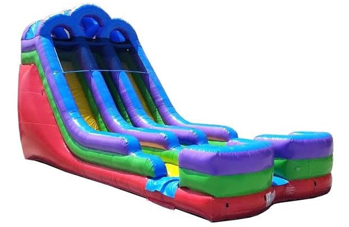 Our 16' double bay slide has two lanes for twice the fun! Kids will enjoy hours of racing each other down! (DRY OR WET)15' wide x 22' long x 16' tall
