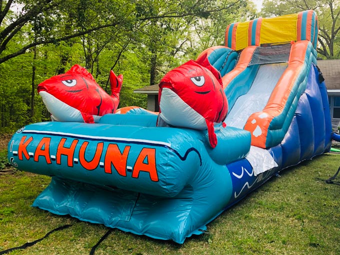 Our Tropical waterslides are our showstopper slides! If you are looking for "the BIG one" that is fun for all ages - this is it! This 22' tall Tropical Super Combo dual lane waterslide towers up 24' in the air making it our tallest slide yet! It comes in at a whopping 65' in length with a connected middle bumper all the way down! It has an inflated pool at the end; not a deep pool. (WET ONLY = comes with 2 blowers)21' wide x 65' long x 24' tall