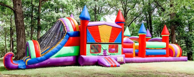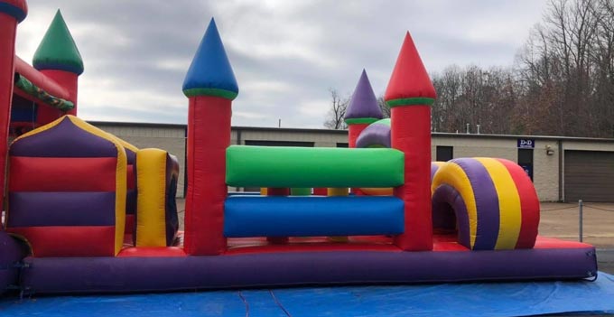 Talk about a showstopper! Battle one-on-one all the way to the end of our newest Obstacle Course! It's 70' of pure fun for everyone! Features a 40' Obstacle Course + a 30' Rock Climb Slide. (DRY ONLY + comes with 2 blowers)11' wide x 70' long x 11' tall