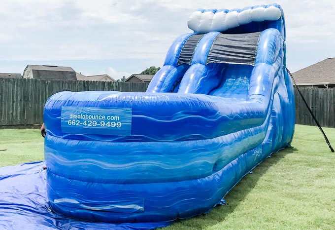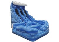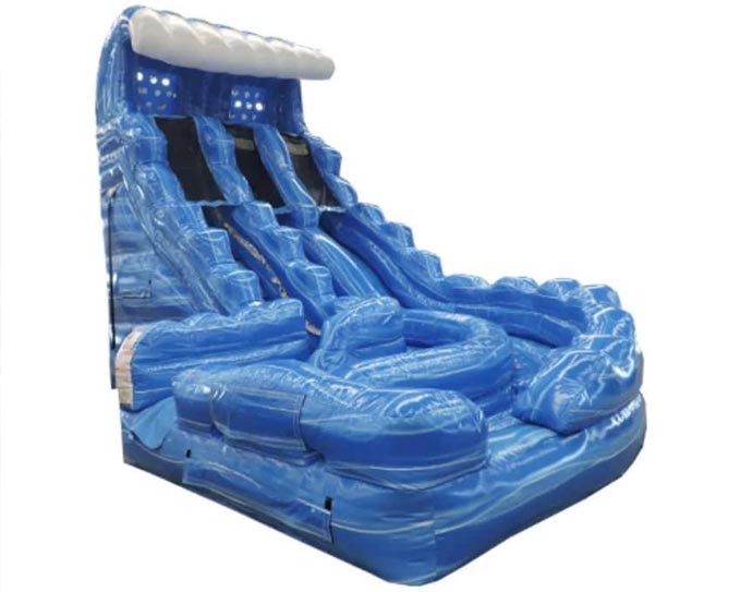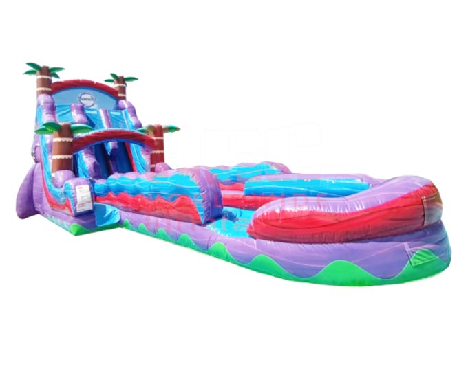 Our Tropical waterslides are our showstopper slides! If you are looking for a waterslide that is fun for all ages - this is it! This 22' tall Tropical Hurricane dual lane waterslide is 45' long, and it's all one piece. It has an inflated pool at the end; not a deep pool. (WET ONLY + comes with 1 blower)18’ wide x 45’ long x 22’ tall