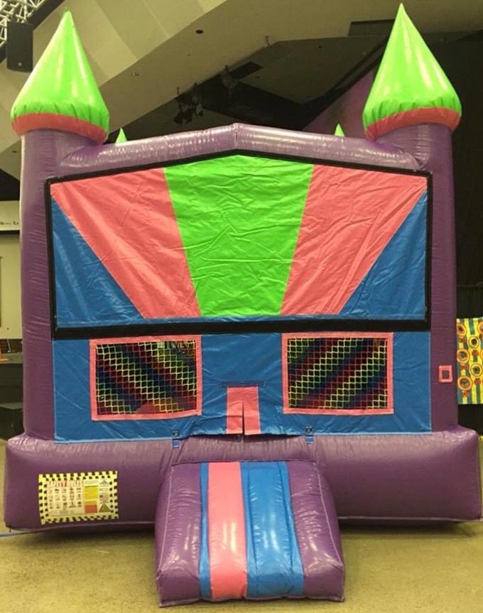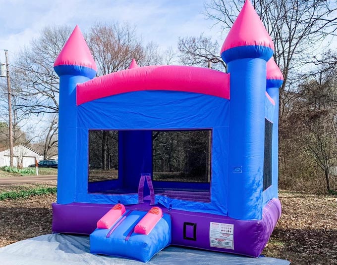 Great fun for the little royals in this 14' x 14' bounce house! Bright pink, purple, and blue make this a little girl's dream bouncy! (DRY ONLY)14' wide x 14' long x 16' tall