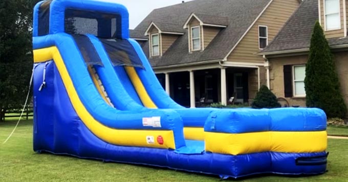 Our 16' double bay slide has two lanes for twice the fun! Kids will enjoy hours of racing each other down! (DRY OR WET)15' wide x 22' long x 16' tall