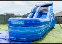 Our Tropical waterslides are our showstopper slides! If you are looking for "the big one" that is fun for all ages - this is it! This 22' tall Tropical Marble dual lane waterslide comes in at a whopping 65' in length! It has an inflated pool at the end; not a deep pool. (WET ONLY + comes with 2 blowers)20’ wide x 65’ long x 22’ tall