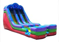 Our Tropical waterslides are our showstopper slides! If you are looking for a waterslide that is fun for all ages - this is it! This 22' tall Tropical Hurricane dual lane waterslide is 45' long, and it's all one piece. It has an inflated pool at the end; not a deep pool. (WET ONLY + comes with 1 blower)18’ wide x 45’ long x 22’ tall