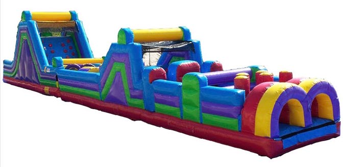 Talk about a showstopper! Battle one-on-one all the way to the end of our newest Obstacle Course! It's 70' of pure fun for everyone! Features a 40' Obstacle Course + a 30' Rock Climb Slide. (DRY ONLY + comes with 2 blowers)11' wide x 70' long x 11' tall