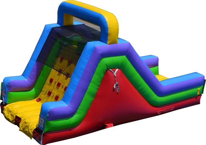 The Retro Style Rock Climb Slide is the best in competitive entertainment for your party or outdoor event. Two contestants can challenge each other to see who can climb up the rock wall and then head down the 12' slide the fastest. The Rock Climb Slide tops out at 30' long and will be the biggest attention grabber at your event! (DRY ONLY)11' wide x 30' long 11' tall