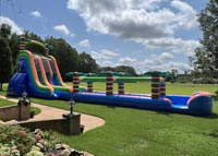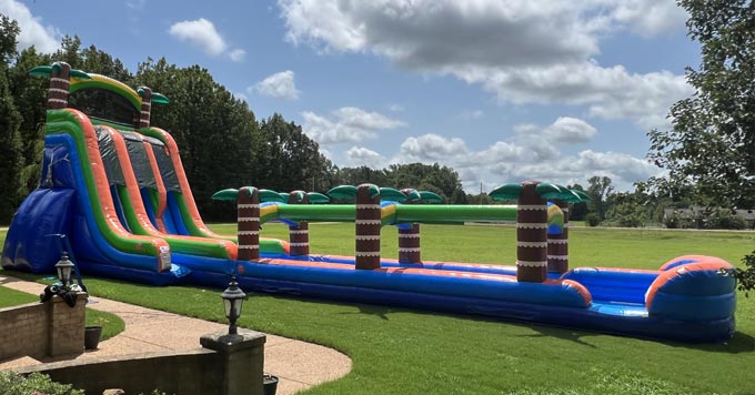 Our Tropical waterslides are our showstopper slides! If you are looking for "the BIG one" that is fun for all ages - this is it! This 22' tall Tropical Super Combo dual lane waterslide towers up 24' in the air making it our tallest slide yet! It comes in at a whopping 65' in length with a connected middle bumper all the way down! It has an inflated pool at the end; not a deep pool. (WET ONLY = comes with 2 blowers)21' wide x 65' long x 24' tall
